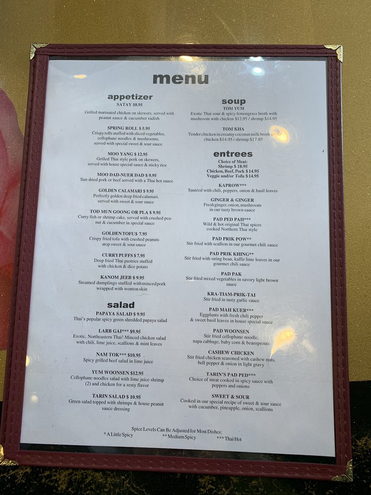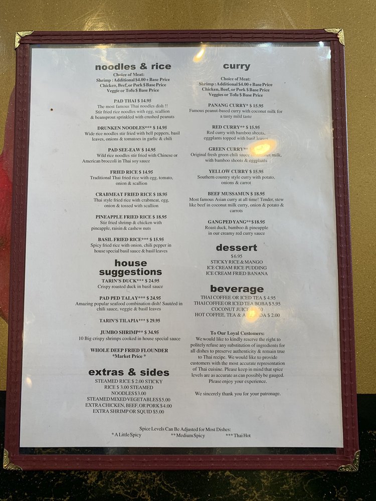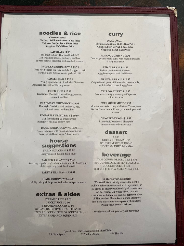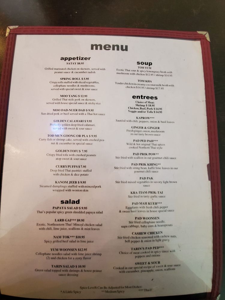 Tarin Thai Cuisine Menu