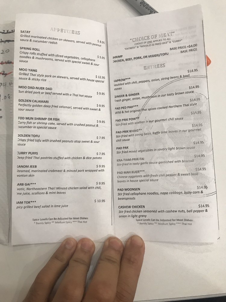 Choice of meat stir fried with bamboo shoot, eggplant, string bean, onion, jalapeno, bell pepper and basil leaves in wild & hot original Thai spices.